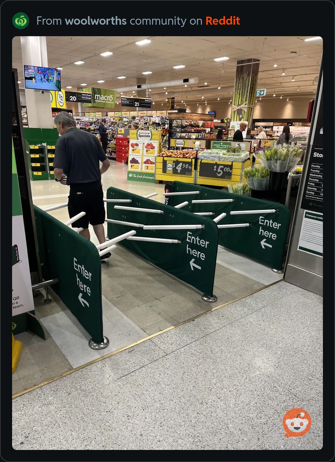 Woolworths trialing more new entry gates. As I was going in last week some other druggy guy with a basket of stolen goods simply pushed through the welcome gates and off he went. If they want to steal they will still do it regardless of what gates you have. The staff working in self serve told me they have people who just jump over them also.