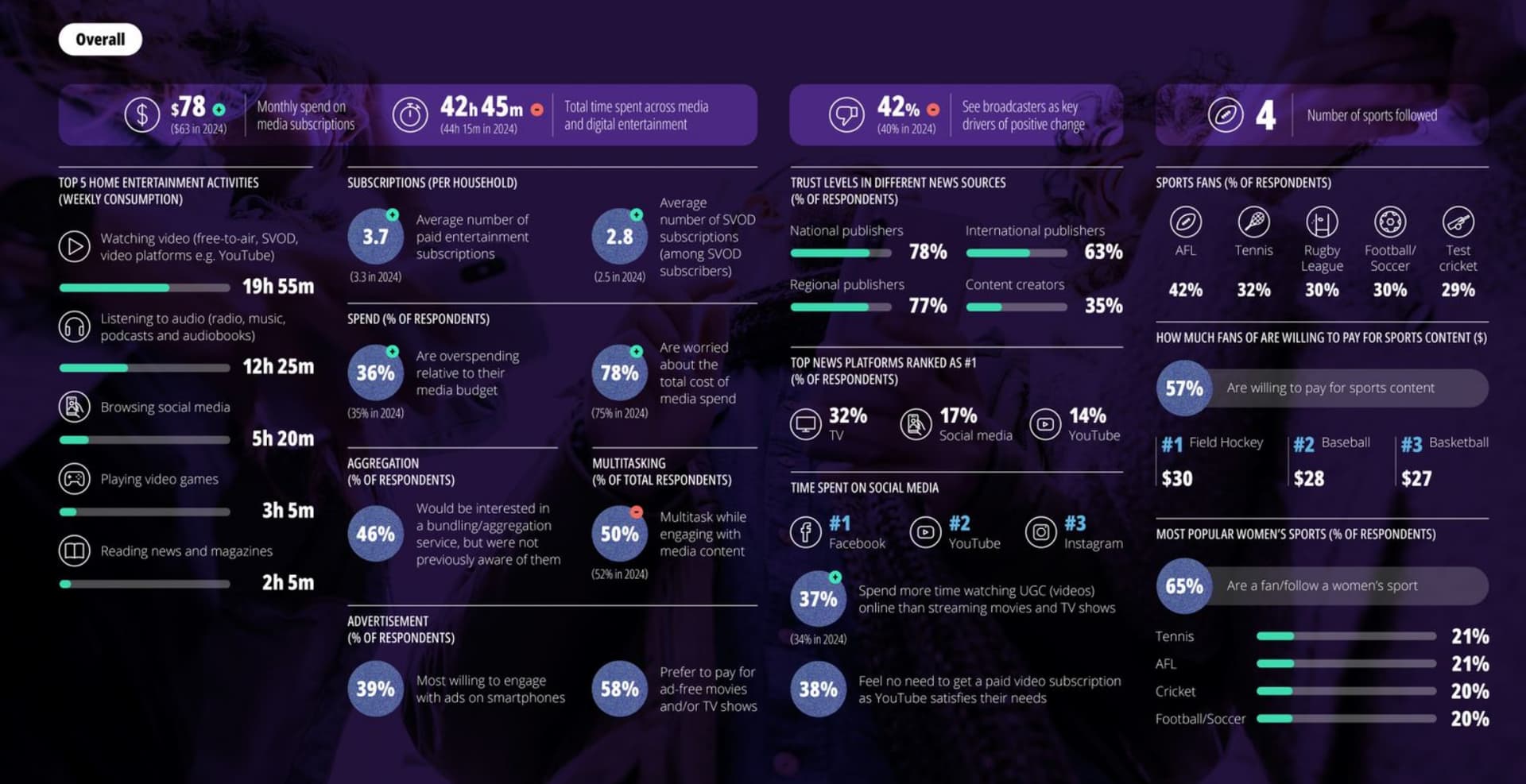 Subscription stacks continue to rise, with Aussie households now holding an average 3.7 services, the biggest lift since COVID, and monthly spend jumping 24%. Gen Z leads with $101 per month, treating entertainment almost as a utility.