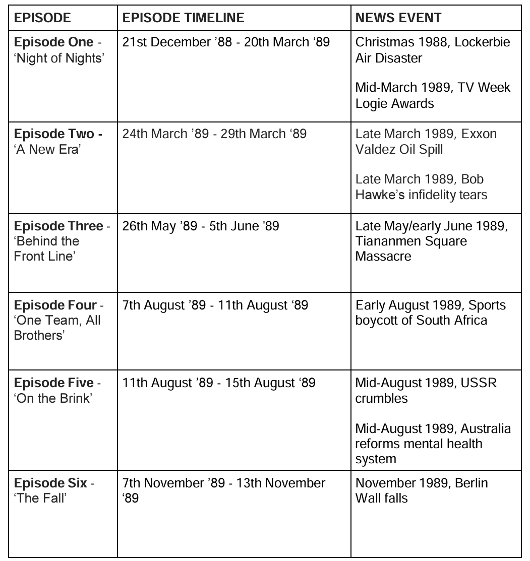 ABC Director of Content, Jennifer Collins said, “The Newsreader Season Three is extraordinary. I never thought that show would get better. But seriously, S3 is next level. The characters, the compelling storyline, this time the real life events are the Exxon Valdez oil spill, the Berlin Wall and the Tiananmen Square, and, of course, the 1989 Logies. This series will not disappoint.”