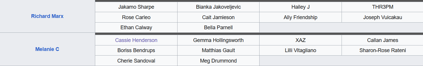 Chair turns: Four **Richard stood up and cheered for her. Later he got on the stage to sing Chorus with her. ** Melanie played him a video message from Emma Bunton from Spice Girls asking Cait to pick Melanie