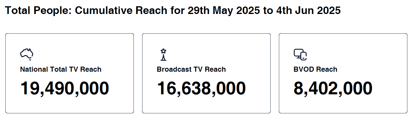 Data © OzTAM Pty Limited 2025. The Data may not be reproduced, published or communicated (electronically or in hard copy) in whole or in part, without the prior written consent of OzTAM.