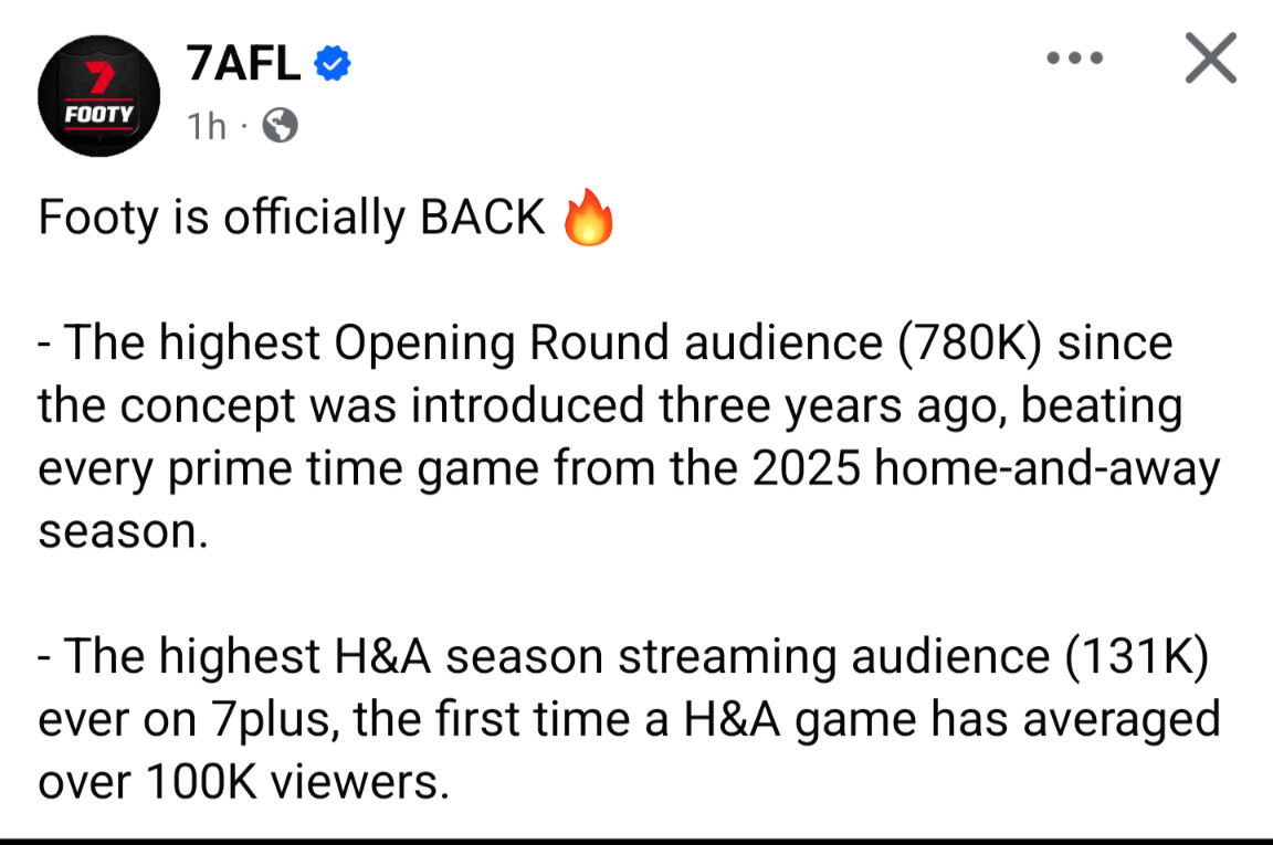 | 1 | SEVEN’S AFL: THURSDAY NIGHT FOOTBALL | Seven | 1,707,000 | 579,000 | 101,000 |