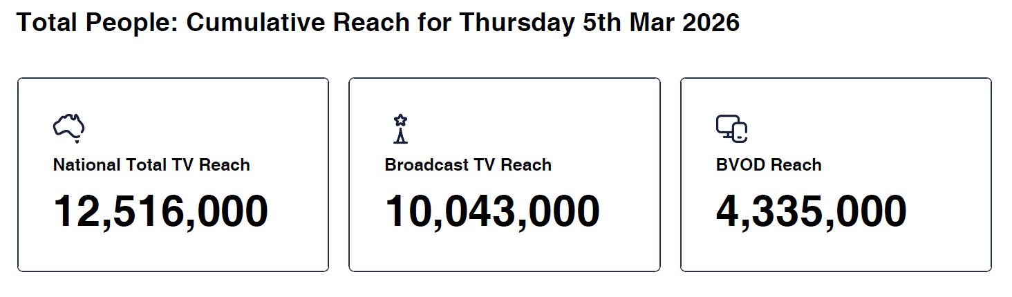 Data © OzTAM Pty Limited 2026. The Data may not be reproduced, published or communicated (electronically or in hard copy) in whole or in part, without the prior written consent of OzTAM.