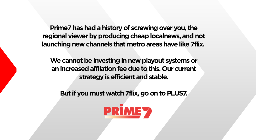 "Prime7 has a proud history of giving regional viewers the middle finger by refusing to invest in local news or provide our audience with the same viewing choice available to their metropolitan counterparts. We just can’t be f#@$ed investing in the infrastructure or coughing up extra in affiliation fees. Besides, Audsley needs to update his company car.