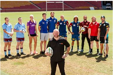 PHOTO DETAIL: Liam Prendergast and Jacob Prideaux (Norths Rugby Club); Gretel Tippett (Firebirds); Ben Wright and Lachlan Venus (Brisbane Bullets); Mitch Robinson and Allen Christensen (Brisbane Lions); Ivan Franjic (Brisbane Roar); Ben Lucas (St.George Queensland Reds) and Joe Burns (Brisbane Heat). Up front, Sam Hargreaves, Triple Mās Sports Guy!