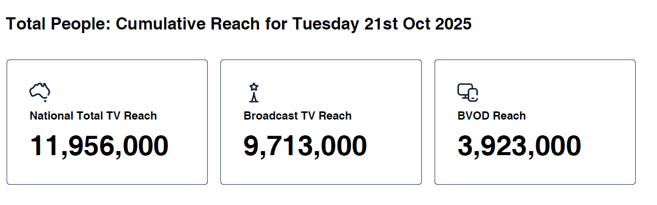 9News was the No. 1 program on Tuesday night across the 5 City Metro and in Sydney, Melbourne and Brisbane with Total People. The combined national bulletins registered a National Total TV Reach of 1.991 million and a Total TV National Audience of 1.273 million (up 10.7% year on year). On 9Now, it secured a BVOD Audience of 177,000 - up an impressive 90.3% year-on-year.