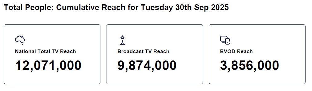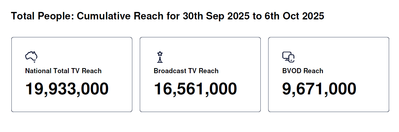 Data © OzTAM Pty Limited 2025. The Data may not be reproduced, published or communicated (electronically or in hard copy) in whole or in part, without the prior written consent of OzTAM.