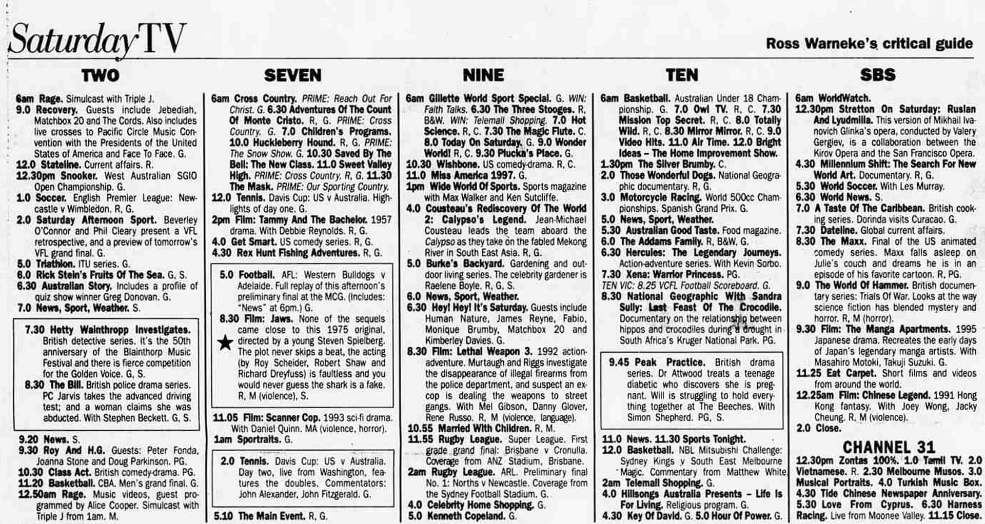 re Football Scoreboard.. This from the Melbourne Age 20 September 1997… looks like a short 5 minute program at 8.25pm on Saturdays on TEN VIC .. did they just chop off the last few minutes of Xena etc?
