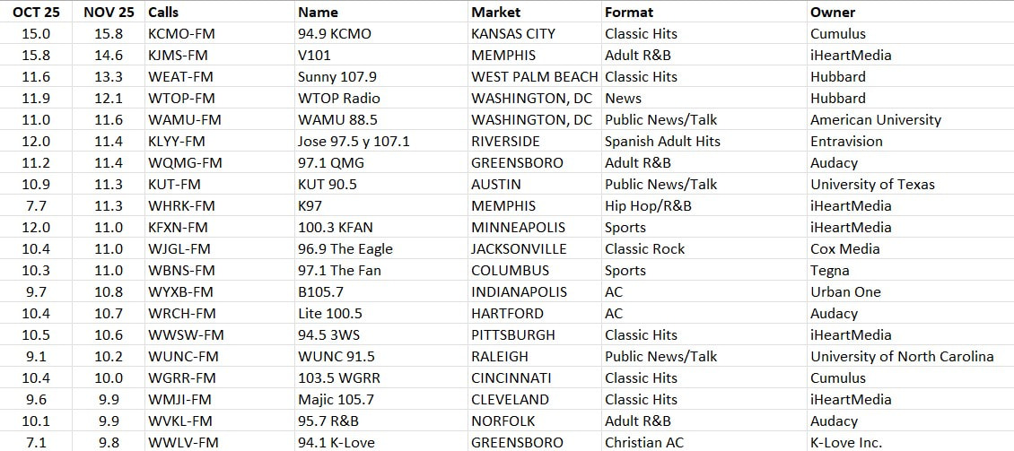 US Cume and Share Leaders from the 48 PPM markets for the period of 16 Oct - 12 Nov. Next survey, we’ll start to see the impact of stations that go all-Christmas.