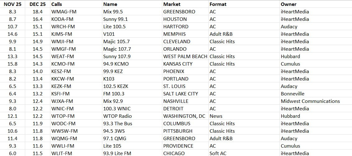 US Cume and Share Leaders from the 48 PPM markets for the December survey. Notice, because of Nielsen’s four-week survey periods, the “December” survey actually coveres 13 Nov - 10 Dec, with the “Holiday” survey taking place for four weeks before January starts. You can see the share leaders dominated by AC and Classic Hits stations. In fact, of the top 20 share leaders, 17 were in all-Christmas music mode during the survey.