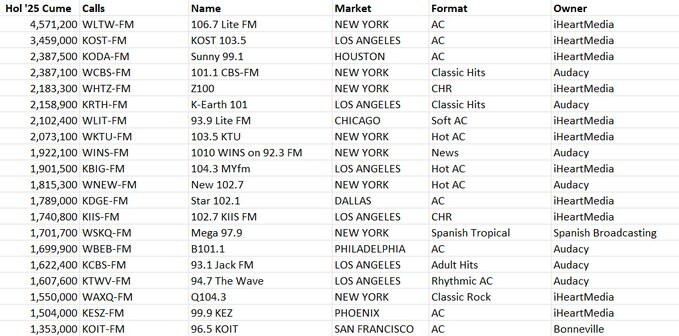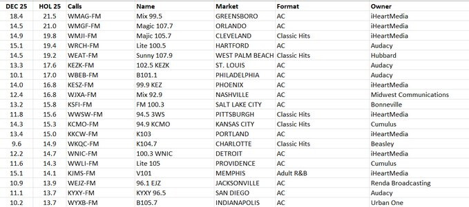 US Cume and Share Leaders from the 48 PPM markets for the “Holiday” survey. Because of Nielsen’s four-week survey periods, this survey actually coveres 11 Dec - 7 Jan. Despite the fact that most of the stations that played all Christmas music did so only for the first half of this survey, they ran up such great numbers in those two weeks, that they still had colossal shares for the four week period. Only 1 of the top 20 stations by share was not playing Christmas music for the first half of the survey. And WMAG/Greensboro’s 21.5 is fourth-largest share recorded in the 16 year history of PPM measurement in the US.