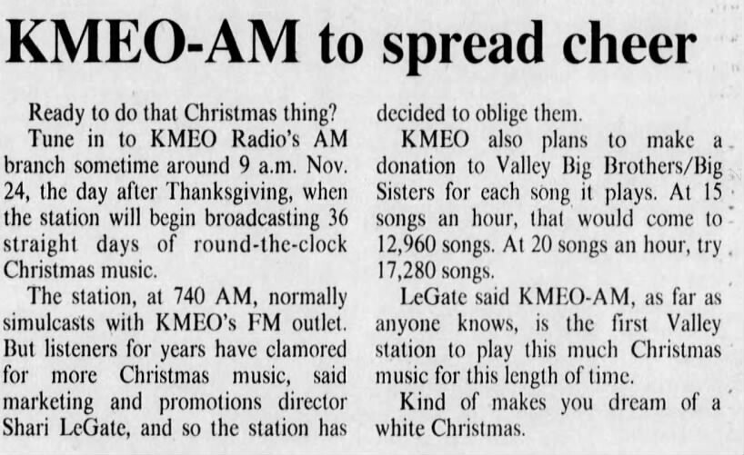 Actually, it was a small AM station in Phoenix that started it all. In 1989, KMEO AM 740 was running an easy listening format… and seldom showing up in the ratings. With nothing to loose, they decided to play non-stop Christmas music starting on Thanksgiving Day 1989. The AM station went from a 0.0 in the summer to a 1.3 share in the fall book. The next year, it repeated the Christmas music strategy, and it pulled a 2.1 share. That station was sold and changed formats, but the success of that little AM station inspired crosstown AC KESZ, which picked up the Christmas music tradition in 1996. The station had been struggling, but in the Fall 1998, it jumped 4.9 to 6.7 for its first-ever #1, and within a couple of years, word of its annual Fall book success started to inspire others to follow suit. Other AC stations within the company (ClearChannel) started adopting the strategy too. The national mood after 9/11 led to even more stations going to the all-Christmas strategy, and finally, when PPM came along and stations could see the dramatic impact in narrower measurement periods, it pretty much guaranteed every market would have at least one, if not two or more, stations running with all-Christmas music from early November through Christmas.