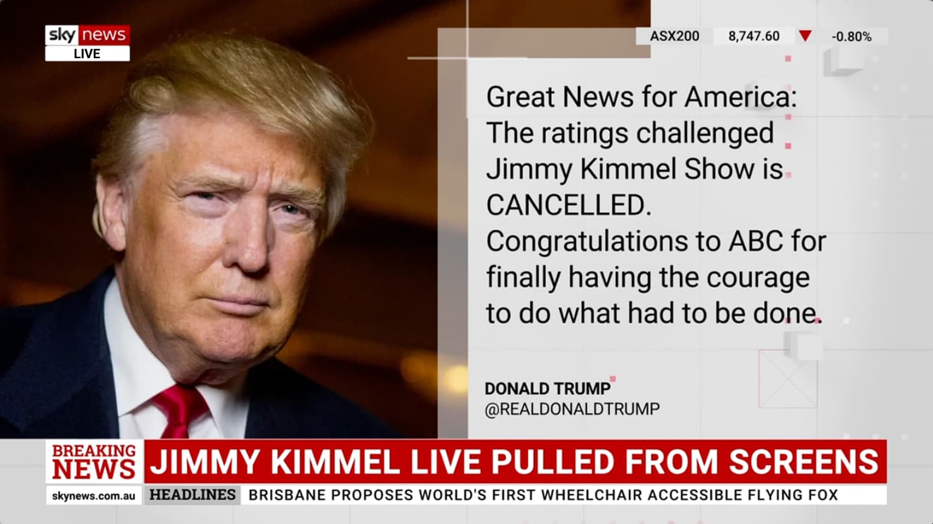 Never liked Jimmy Kimmel never thought he was family , not sorry to see him go. I saw his comment it was poor taste. Donât think it warranted a complete wank overreaction. Suppose they have to opprse the mighty overlords at Disney .