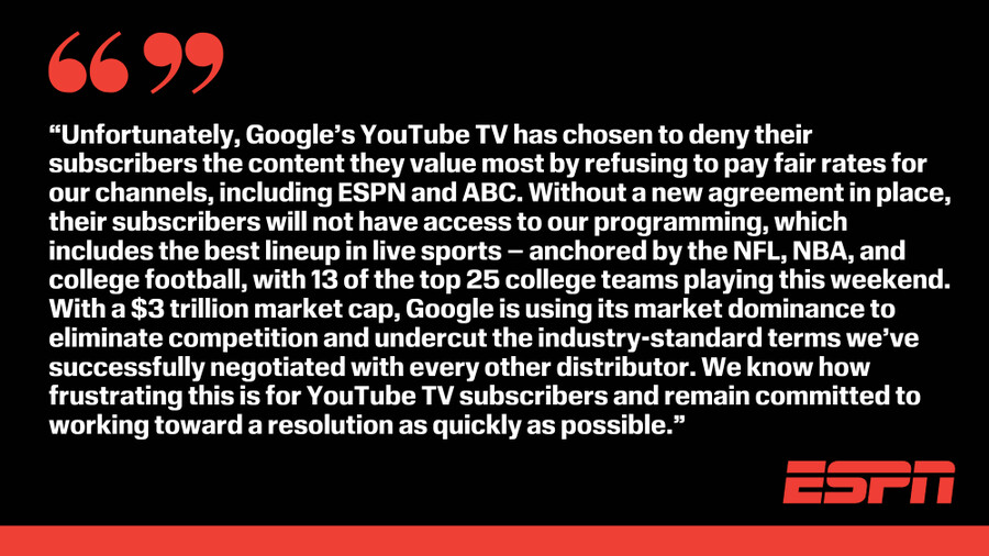 At midnight U.S. eastern time (3pm AEDT), Disney networks have officially gone dark on YouTube TV. It includes, but not limited to, ESPN nets and ABC.