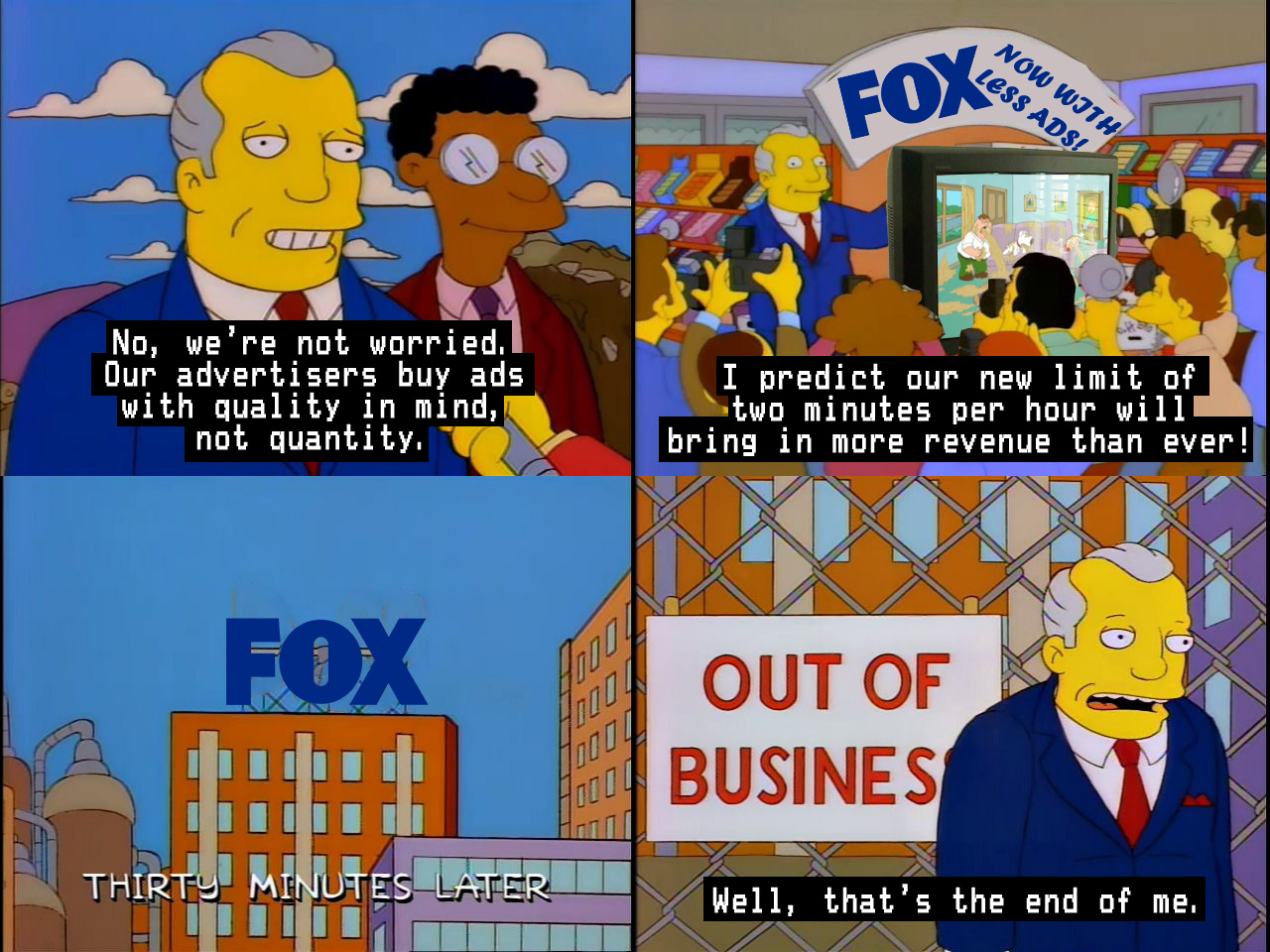 Fox is planning to cut down on the minutes of ads shown during programming from 16 minutes today to only 2 minutes by 2020. No idea how they can afford this but ok. NBC recently began to reduce the amount of ads shown during programs by 20%, in response to a general lack of enthusiasm by consumers for long ad breaks due to ad-free streaming services such as Netflix.