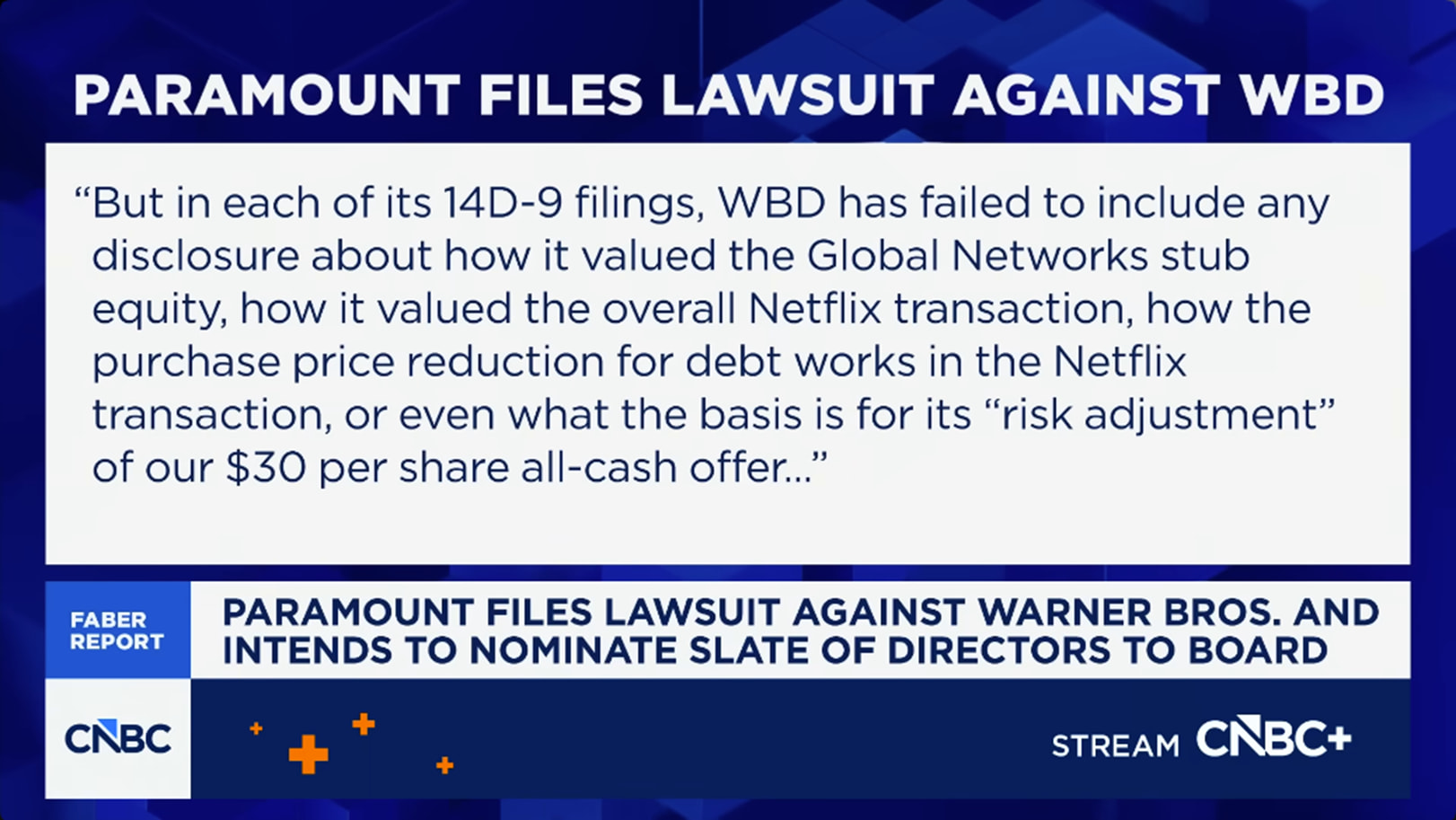 …WBD shareholders need this information to make an informed investment decision on our offer – and importantly, Delaware law has consistently required that such information be provided to shareholders. Following the process prescribed under Delaware law, we filed suit this morning in Delaware Chancery Court to ask the court to simply direct WBD to provide this information so that WBD shareholders have what they need to be able to make an informed decision as to whether to tender their shares into our offer.