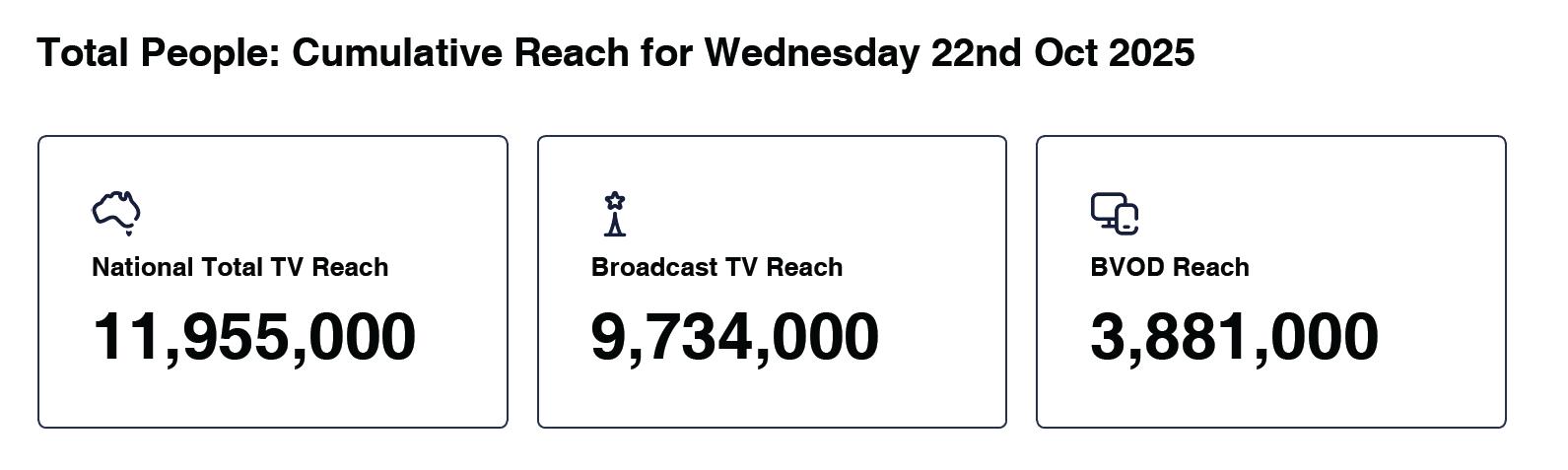Data © OzTAM Pty Limited 2025. The Data may not be reproduced, published or communicated (electronically or in hard copy) in whole or in part, without the prior written consent of OzTAM.
