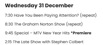 | 1 | NEW YEAR’S EVE 2025: LIVE CONCERT FROM THE OPERA HOUSE-EV | ABC | 3,438,000 | 1,057,000 | 161,000 |