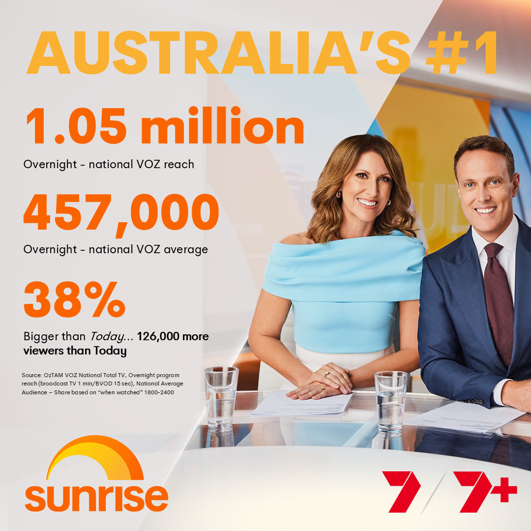 | 13 | SUNRISE | Seven | 1,053,000 | 457,000 | 62,000 |