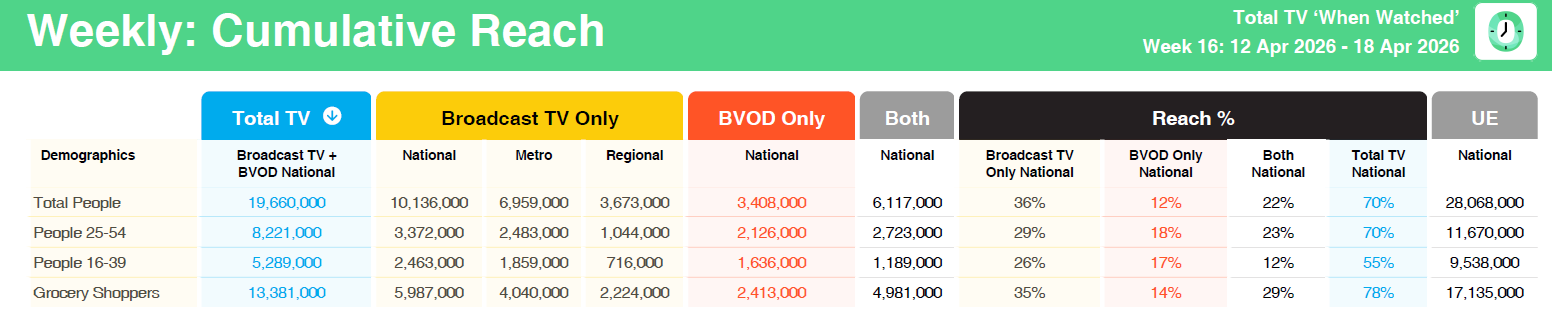 - 7NEWS Thursday: #1 program in all people and grocery shoppers, #1 news program. National reach 2.25 million, national audience 1.38 million.
